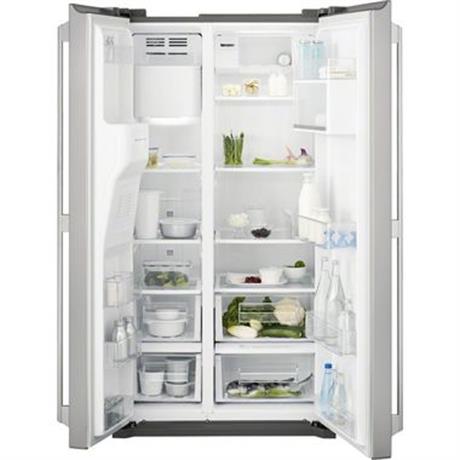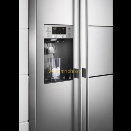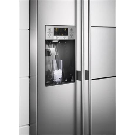 Side by side chladnička Electrolux EAL6140WOU s nerezovým vzhledem dvířek a zapuštěným dávkovačem ledu a vody. S tímto dávkovačem ledu a chlazené, filtrované vody můžete vaše hosty vždy osvěžit. Dokáže vyrobit až 120 kostek ledu za 24 hodin. Pro kontrolu chladničky a mrazničky pouhým dotykem prstů je tento model vybaven plně elektronickým ovládáním.