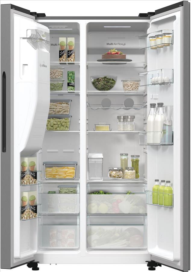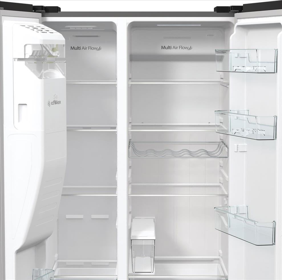 Skladujte veškeré své potraviny v optimálních podmínkách uvnitř elegantní americké lednice Hisense RS5P535NTCE. S celkovým objemem 566 litrů pojme veškeré potraviny. Chytře řešený vnitřní prostor nabízí spoustu místa, kam lze umístit všechny potraviny i nápoje. Stejná teplota v každé části lednice je zajištěna systémem proudění vzduchu Multi Air Flow. Vnitřní prostor lednice je opatřen LED osvětlením.