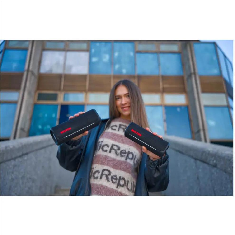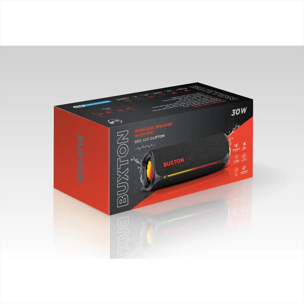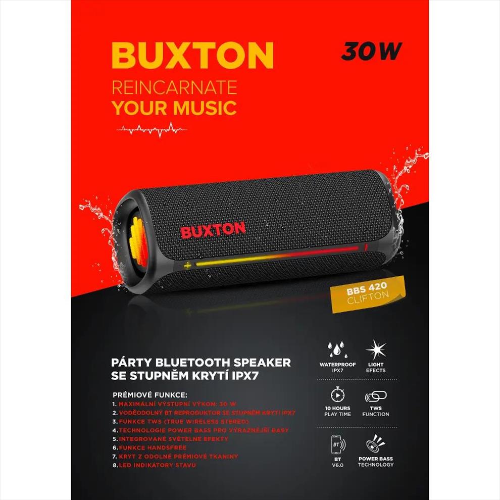 Buxton BBS 420 Clifton je bezdrátový reproduktor, který si jednoduše užijete. Přináší zážitek z poslechu kdykoli a kdekoli a díky maximálnímu výkonu 30 W a technologii Power Bass si užijete i pořádnou párty. Reproduktor disponuje voděodolností se stupněm krytí IPX7, takže si poradí i s létajícími kapkami z bazénu nebo lehkým deštěm. Jeho elegantní design s textilním potahem působí stylově a vestavěné světelné efekty dodají každému poslechu příjemnou atmosféru. Ovládání je snadné a přehledné. K tomu přispívají praktické LED indikátory stavu. Součástí je handsfree mikrofon pro telefonní hovory.