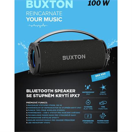 BT reproduktor Buxton BBS 650 FOXHILL má všechny potřebné vlastnosti spolehlivého párty parťáka. O perfektní zvuk se zvýrazněnými basy se postará technologie Power Bass. Zásluhou maximálního výstupního výkonu 100 W a dosahu Bluetooth připojení až 15 m si můžete vychutnávat dokonale čistý zvuk, který se postará o dlouhotrvající zážitek.