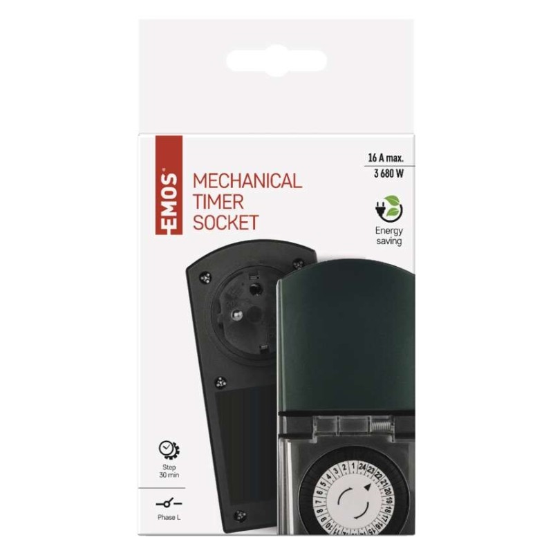 Mechanická spínací zásuvka s 24hodinovým cyklem. Minimální nastavitelný časový úsek je 30 minut. Krytí IP44 umožňuje použití mechanické spínací zásuvky ve venkovních prostorech. Provozní teplota -25 °C do +50 °C.