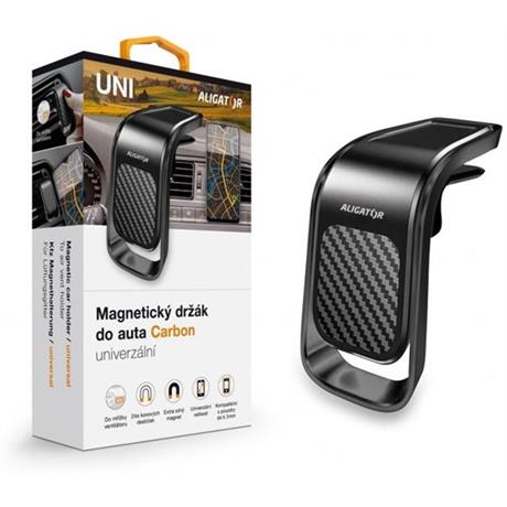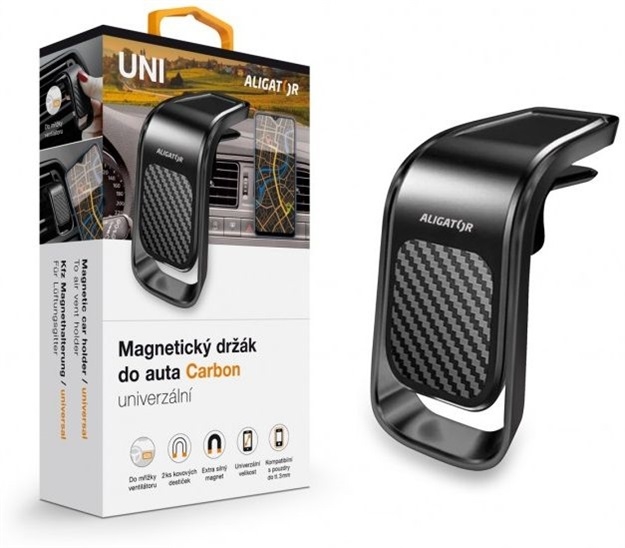 Magnetický držák do auta HA15 Aligator Carbon, univerzální. Díky integrovanému silnému magnetu lze zafixovat telefon prakticky jakýchkoliv rozměrů. Pomocí šetrného, ale přitom spolehlivého mechanismu, lze snadno připevnit k ventilační mřížce bez rizika jejího poškození.