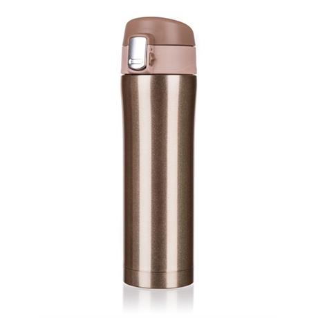 Termoska BODO 430ml zla.met.; Cestovní termoska BODO o objemu 430 ml má vnější i vnitřní povrch z nerezi a plastové vyklápěcí víčko. Díky dvoustěnnému provedení si udrží nápoj déle svou teplotu. Víčko se otevírá stisknutím pojistky, u které je zámek zabraňující nechtěnému otevření termosky.