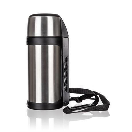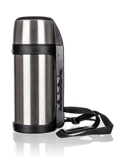 Termoska cest. PENTA 1,5l ner.; Nerezová cestovní termoska PENTA o objemu 1,5 l, má dvouplášťové provedení, vnější i vnitřní povrch je vyroben z nerezi 201. Má plastový uzávěr a ve víčku termosky je vložen pohárek na pití. Součástí termosky je plastové držadlo a popruh pro pohodlné nošení. Nerezové termosky jsou velmi odolné a bezpečné, nehrozí rozbití vložky či opaření při manipulaci. Teplotní pokles je závislý na teplotě nápoje při plnění, množství nápoje a teplotě okolí.