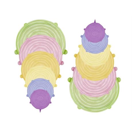 vyrobeno ze silikonu, neobsahuje BPA, ekologické, opakovaně použitelné, omyvatelné, teplotní odolnost od -20°C do +230°C, lze použít v mikrovlnné troubě, vhodné do myčky, průměr víček 6,5 cm, 9,5 cm; 11,5 cm, 14,5 cm, 16,5 cm a 20,5 cm