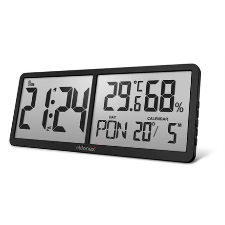 Nástěnné hodiny řízené rádiovým signálem; Velký digitální LCD displej; Zobrazení času (hodiny, minuty), data, vnitřní teploty a vlhkosti vzduchu; Vnitřní teplota -9.9 °C ~ 50°C (14.2°F ~ 122°F); Rozsah vlhkosti: 19% ~ 96%