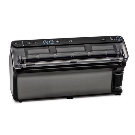 inovativní technologie pro vakuování tekutých potravin, příkon 186W, vakuuje suché, vlhké, tekuté, Sous Vide, pulzní odsávání a marinuje, má řezačku fólií, odsává sáčky i dózy, automatický režim, součátí balení 1 role a 4 zip sáčky