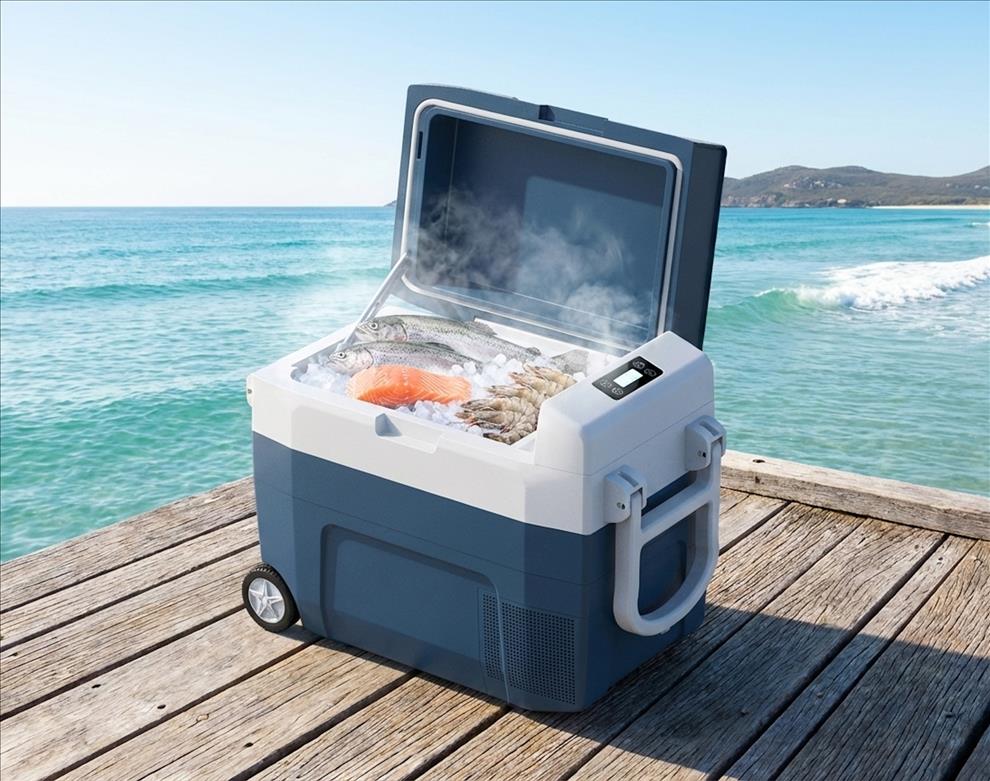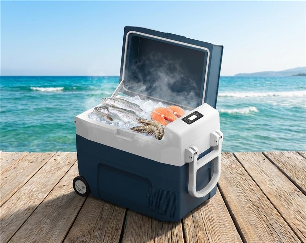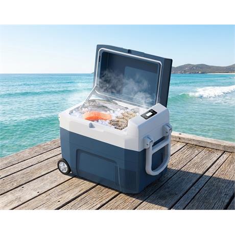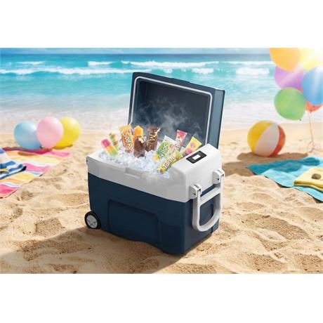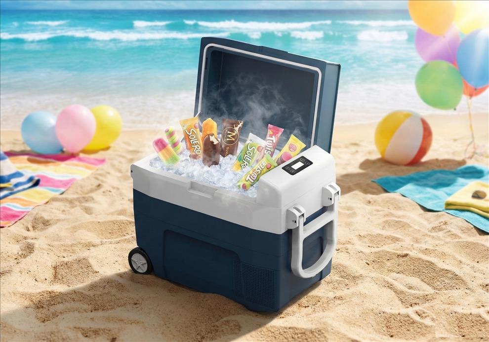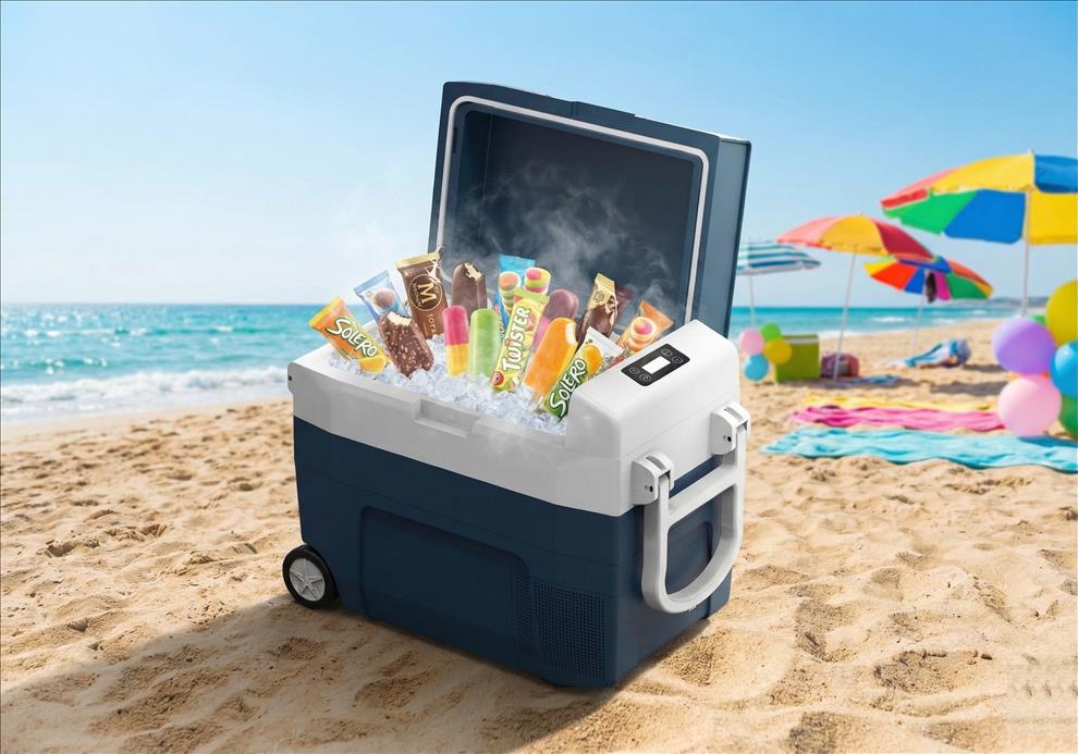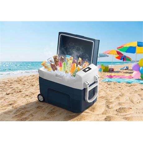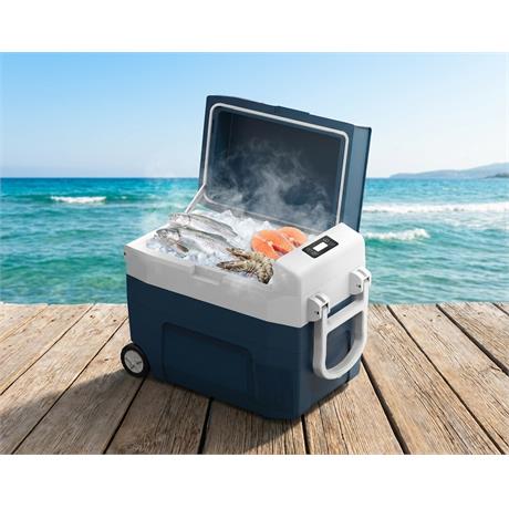 Chladící box rodinné velikosti vybavený kolečky a madlem