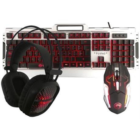 Sada klávesnice s herní myší,sluchátky,US,herní,drát(USB),černo-stříbrná;6 tlačítková myš;DPI:1200/1600/2400/3200;Podsvícení ve 4 barvách;Membránová klávesnice;Kláves 104;19 bezkonfliktních kláves;Podsvícení ve 3 barvách;Průměr reproduktoru:40mm;Citlivost mikrofonu:-38±3dB;Rozhraní:USB+2x3,5mm jack