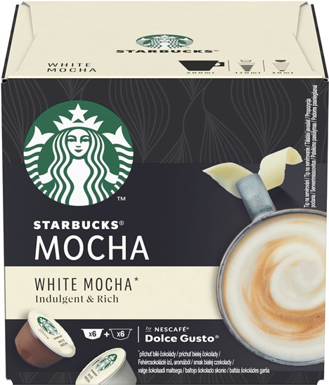 • STARBUCKS® White Mocha by NESCAFE® DOLCE GUSTO® • Vychutnejte si lahodný nápoj s bohatou chutí, který si můžete připravit doma ze stejně kvalitních zrn 100% arabiky, jaká používáme v našich kavárnách.• Kávové kapsle jsou kompatibilní s kávovary NESCAFE DOLCE GUSTO. 6 porcí v jednom balení.• Záv