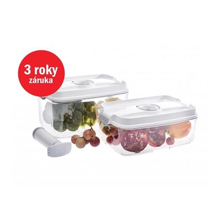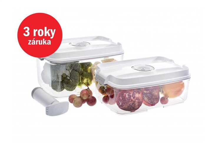 2 vakuovací dózy s víky: 1,4 a 2 l + ruční vakuová pumpa, odolný a trvanlivý tritan, 3letá záruka, vhodné do mrazáku, myčky i mikrovlnky, vyrobeno ve Slovinsku