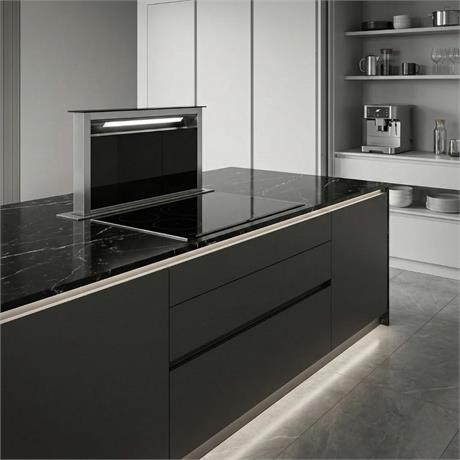 Je určena k instalaci přímo do pracovní desky za varnou plochu. Jakmile ji zapnete, vysune se z pracovní desky sací část a začne odsávat páry a pachy nejen z prostoru nad varnou deskou, ale rovnou z celé kuchyně.