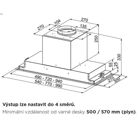 Největší předností digestoře je možnost volitelného výstupu vzduchu do 4 směrů - nahoru, do boku nebo dozadu.