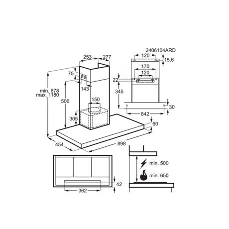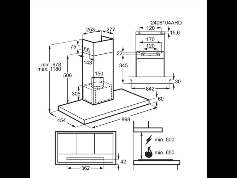 Digestoř. ELECTROLUX LFT819K. . Třída energetické účinnosti: A. Třída účinnosti tukové filtrace: C. Roční spotřeba energie (kW/rok): 62.5. Třída účinnosti dynamiky tekutin: A. Třída účinnosti osvětlení: A. . Recirkulace. Stupně výkonu: 3+Intensive; Breezefunction. Ovládání: Dotykové na skle, Bílé nebo červené světlo. Osvětlení: LED proužek. Spojení Hob2Hood. . Rozměry V x Š x H (mm): 678 x 898 x 454