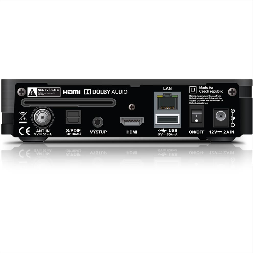 DVB-T2 set-top box certifikovaný pro příjem s kodekem HEVC/H.265 v rozlišení Full HD. Plná podpora HbbTV i Dolby Digital, programový průvodce EPG v češtině, HDMI (CEC), USB, optický audio výstup, LAN, analogový AV výstup.
