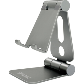 Univerzální kovový držák telefonu Skládací systém Slitina hliníku Nastavitelná výška a náklon Stolní kovový držák vhodný pro mobilní telefony a tablety do maximální velikosti úhlopříčky 7"". Ideální sklon a výšku nastavíte díky dvěma polohovatelným kloubům. Držák je možné složit do vodorovné polohy vhodné pro přepravu. Zařízení můžete položit na držák v horizontální nebo vertikální poloze. Výřezy na kabely podporují nabíjení zařízení během položení na držák. Materiál: Hliník + silikonová pryž Rozměry: 64×77×103 mm Hmotnost: 80 g Barva: Šedá