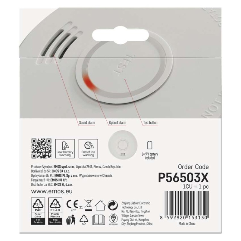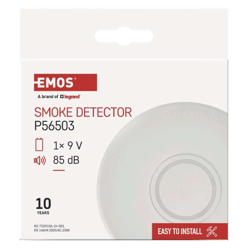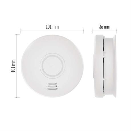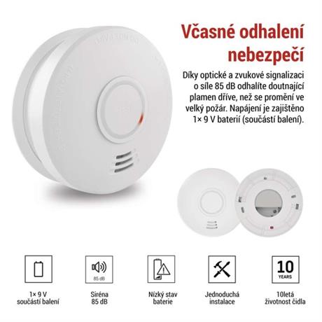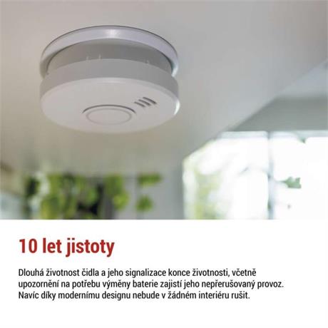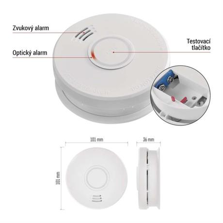 další funkce: –|dosah modulu: –|hlasitost signalizace: >85 dB ve vzdálenosti 3 m|jazyky aplikace: –|kompatibilita: –|krytí: –|možnost propojení s dalšími detektory: –|napájení: 1× 9 V, součástí balení|notifikace do mobilní aplikace: –|ovládání hlasovými asistenty: –|paměť poplachů: –|podporované OS: –|poplachová teplota: –|přenosová frekvence: –|prodejní obal: 1 ks, krabička|protokol: –|provozní teplota: 0 °C až 40 °C|provozní vlhkost: 5–95 %|rozměr: 101 × 36 mm|typ detekce: detektor kouře|typ instalace: montáž na zeď nebo volně stojící|typ signalizace: optická i zvuková|určeno pro typ: –|životnost: 10 let