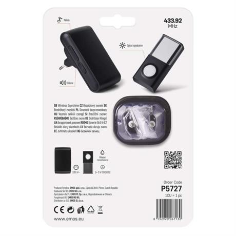 barva: černá|dosah tlačítka: 150 m|maximální hlasitost zvonění: 85 dB|možnost přidat další tlačítko: ano, max. 6|napájení hlavní jednotky: 230 V AC|napájení tlačítka: 1× 3 V CR2032 (součástí balení)|optická signalizace na tlačítku: ano|optická signalizace na zvonku: ne|počet melodií: 36|počet přijímačů v balení: 1 ks|počet tlačítek v balení: 1 ks|přenosová frekvence: 433 MHz|přídavné (náhradní) tlačítko: P5727T|prodejní obal: 1 ks, blistr|regulace hlasitosti: ano, 4 úrovně|rozměr tlačítka: 22 × 85 × 38 mm|rozměr zvonku: 67 × 65 × 105 mm|speciální funkce: ne|voděodolné tlačítko: IP44|způsob párování: automatické párování – self-learning|způsob přenosu: bezdrátový zvonek