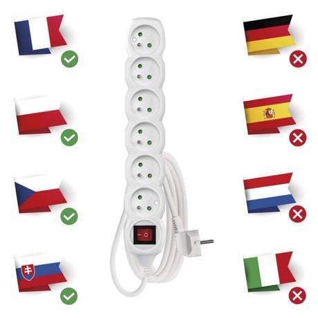 Bílý prodlužovací přívod, 6 zásuvka s vypínačem, délkou 3 m a průřezem vodiče 1 mm2. Vhodný pro maximální zátěž 10 A max.