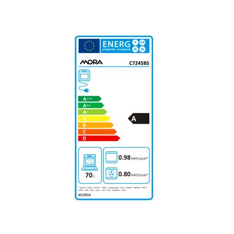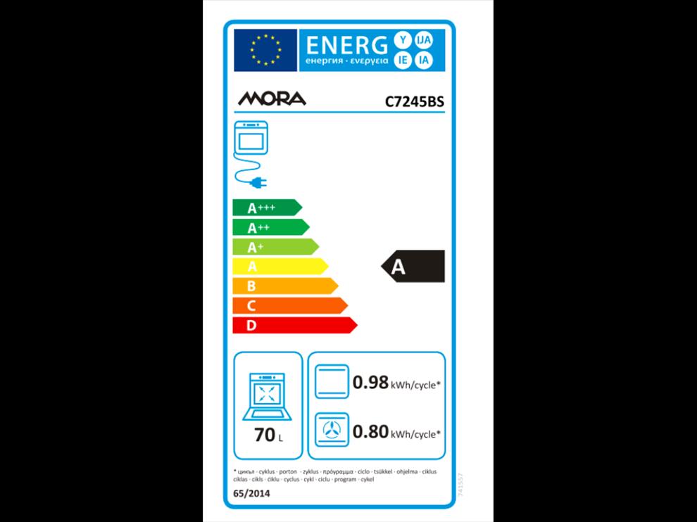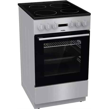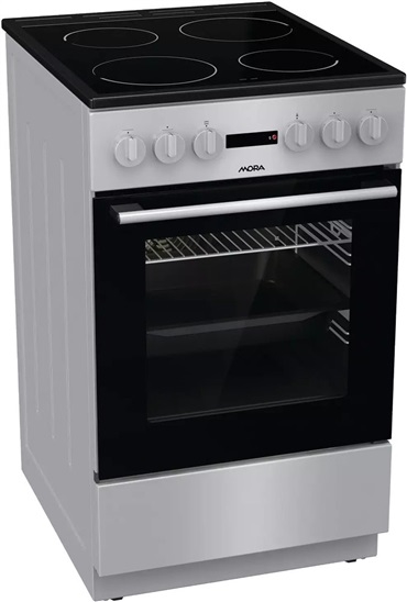 Energetická třída A, maximální příkon 9100 W, sklokeramická deska, 4 varné zóny, ukazatel zbytkového tepla varných zón, stříbrná barva, kruhové těleso, multifunkční trouba - 11 způsobů ohřevu, objem trouby 70 l, rozměry VxŠxH v mm (850x500x594), hmotnost 38,1 kg, chladná dvířka trouby