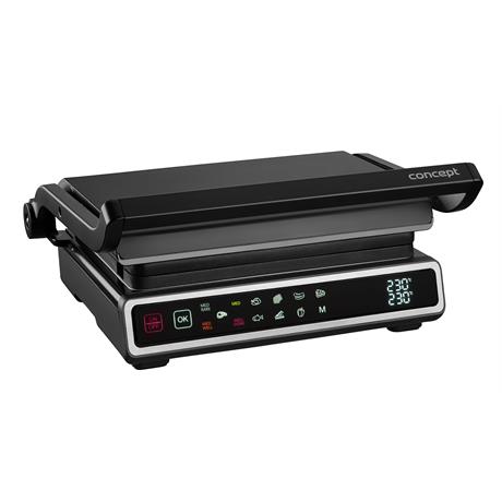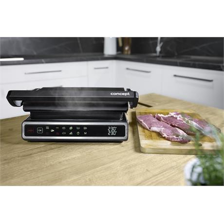 Kontaktní gril s teplotní sondou Concept GE3550 disponuje nepřilnavými deskami, které umožňují grilování bez oleje a snadno se čistí. Je vybaven chytrými funkcemi Split zone, Gril assistant, plotnami na vafle, digitálním ovládáním a 11 automatickými programy vč. manuálního režimu DIY.