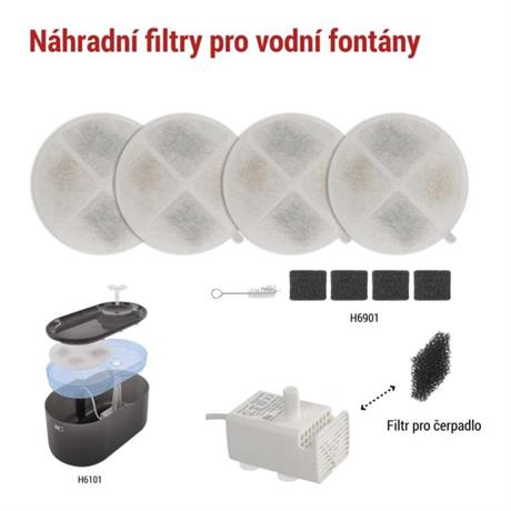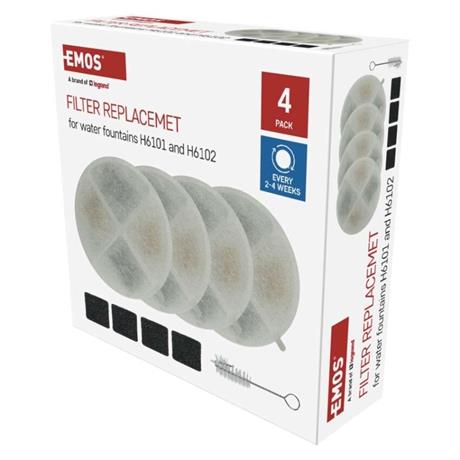 Sada náhradních filtrů obsahuje 4 ks kvalitních bavlněných filtrů s iontovým výměníkem, kokosovým vláknem a aktivním uhlím, 4 ks filtrů pro čerpadlo a čistící kartáček. Tato náhradní sada filtrů je vhodná pro EMOS Vodní fontánu PET-201 (H6101) a GoSmart Vodní fontánu PET-202 (H6102).