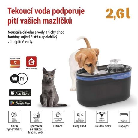 Chytrá vodní fontána pro domácí mazlíčky kombinuje tichý a bezpečný provoz s jedinečným designem. Fontána je vybavena 360° tryskou, která stříká vodu do všech směrů, a zároveň má část, kde se voda drží, což je ideální pro mazlíčky, kteří preferují jak tekoucí, tak i stojatou vodu. Neustálá cirkulace vody přes kvalitní filtrační systém zajišťuje, že voda je vždy čistá a svěží.