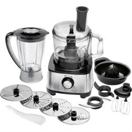 Food procesor. PROFICOOK KM 1063. . Kompaktní kuchyňský robot. Turbo funkce. Multifunkční. Vysoká stabilita. Odměrka o objemu 3 cl. Mísa 1,2 l. Míchací mísa 1,75 l. Výkon 1200 W. . Příslušenství:. Citrusovač. 2x struhadlový kotouč. 2x řezný kotouč. Bramborový rošt. Sekáček. Šlehací metla. Hnětací metla. Škrabka. . Barva stříbrná/černá