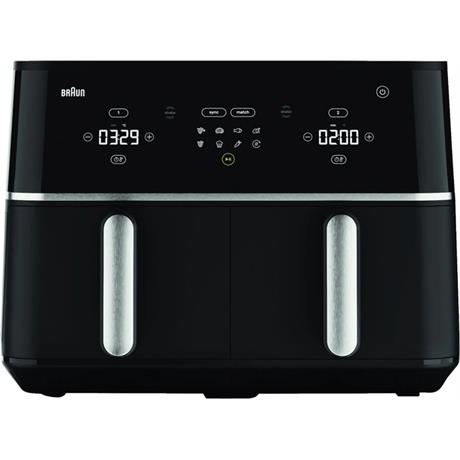 Horkovzdušná fritéza Braun TwinCook 5 TD5030; 2400 W; objem 2× 5 l (10 l); keramický nepřilnavý povrch; 8 programů; nezávislé ovládání teploty; funkce synchronizace/sladění; digitální časovač; automatické vypnutí; hmotnost 8,6 kg; matná černá.