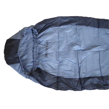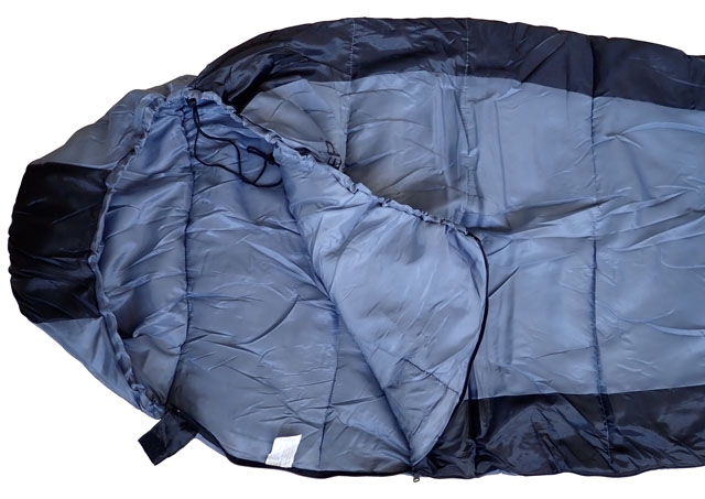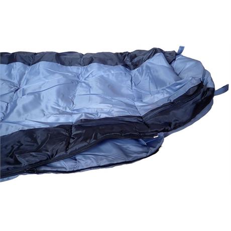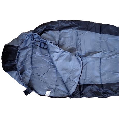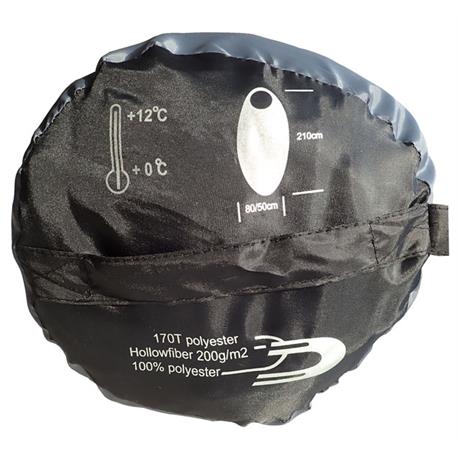 Mumiový spacák o rozměrech 210 x 80/55 cm, vhodné pro každého dospělého, duté vlákno s výbornými tepelně izolačními vlastnostmi, minimální venkovní teplota 0 °C, černá a šedá barva.