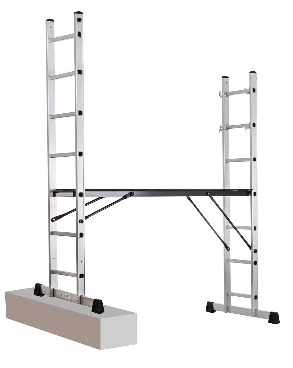 Multifunkční lešení G21 Handrail má různé kombinace využití. Můžete ho použít jako samostatný žebřík o různých délkách, štafle a lešení (o velikosti plošiny 159 x 40 cm), které má 2 stabilní opěrné nohy.