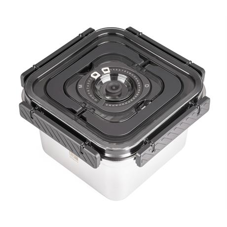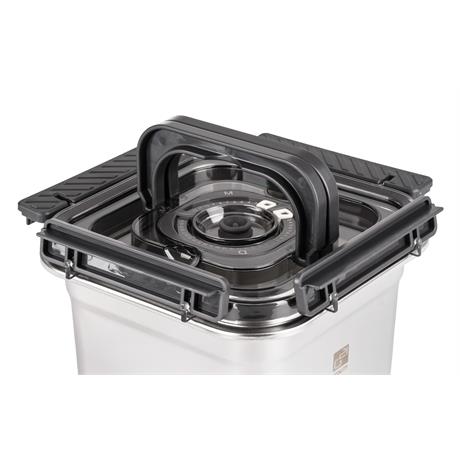Víko z BPA Free plastu je vybavené vakuovacím ventilem a praktickým nastavitelným ukazatelem data. Budete tak vědět, kdy byly potraviny vakuovány nebo do kdy se mají spotřebovat. Pro uvolnění vakua a otevření dózy stačí jemně zmáčknout ventil uprostřed víka.