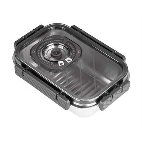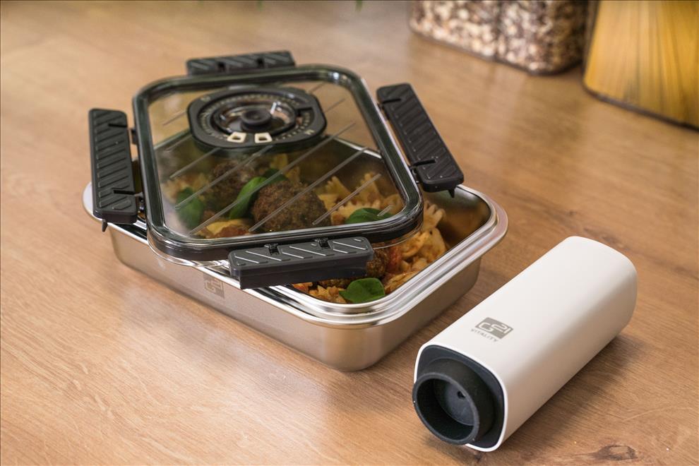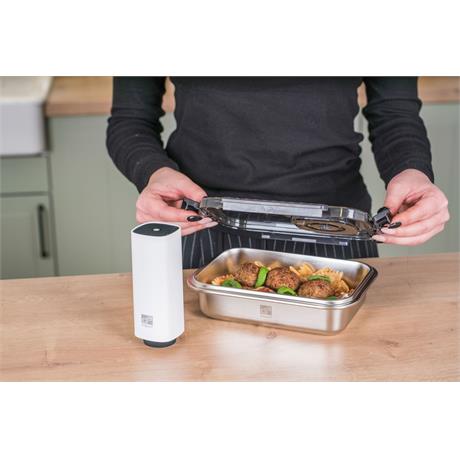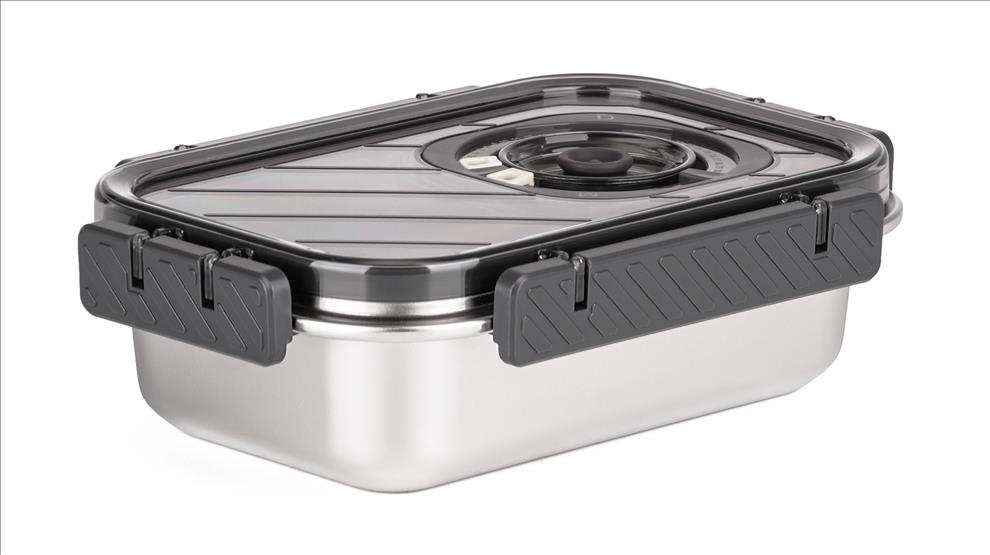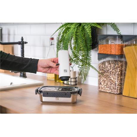 Víko z BPA Free plastu je vybavené vakuovacím ventilem a praktickým nastavitelným ukazatelem data. Budete tak vědět, kdy byly potraviny vakuovány nebo do kdy se mají spotřebovat. Pro uvolnění vakua a otevření dózy stačí jemně zmáčknout ventil uprostřed víka.