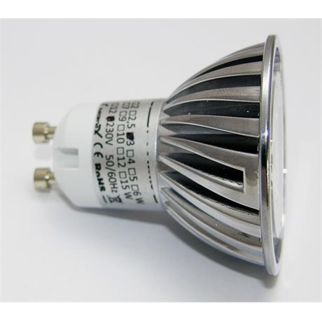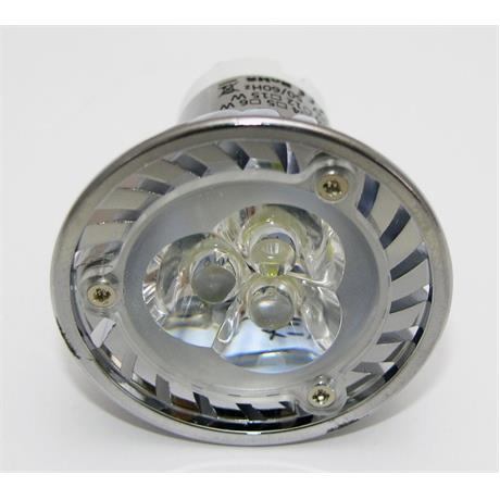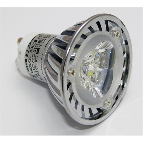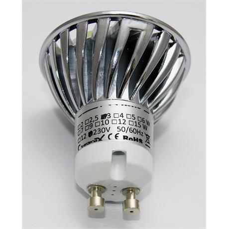 LED žárovka, patice GU10, napájení AC 230V, příkon 3W, barva světla 2700-3500K (teplá bílá), světelný tok 240lm, 3x LED typu SMD Everlight, úhel svitu 38°, náhrada 25W žárovky, životnost až 50 000 hodin.