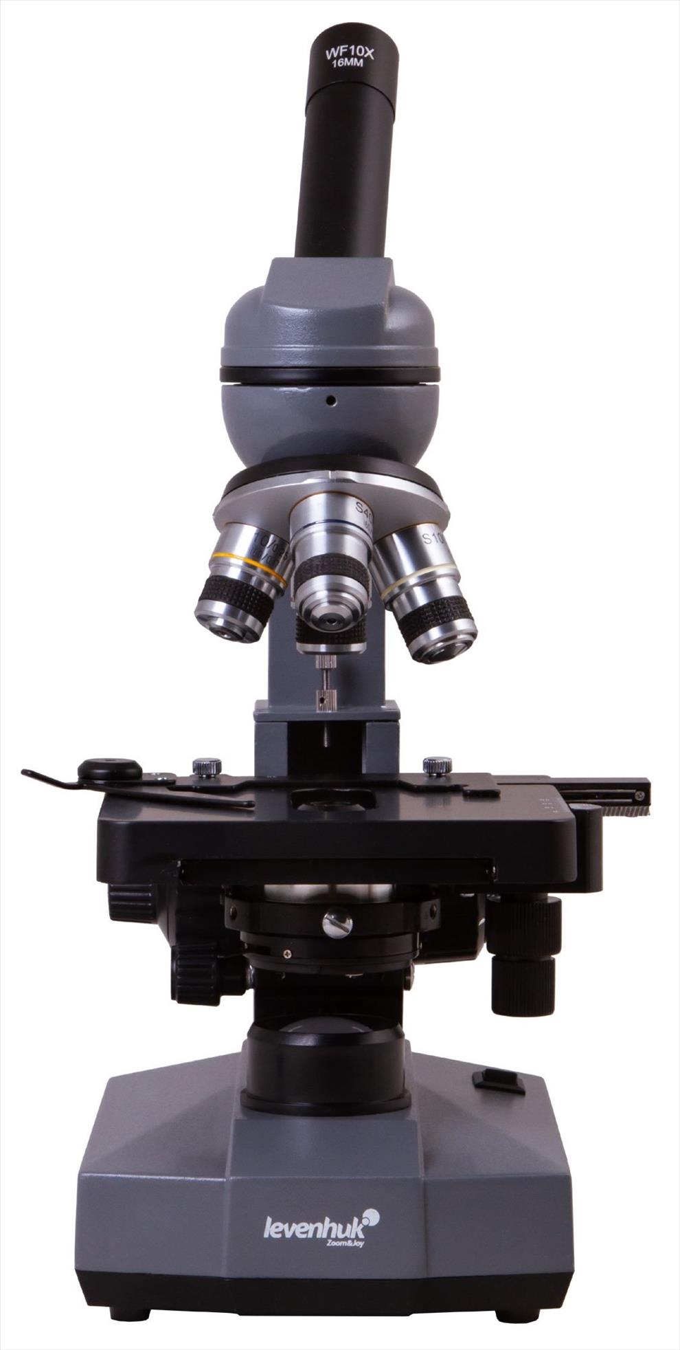Mikroskop je vybaven monokulární hlavicí, která se otáčí o 360°. Jeho úhel sklonu je 45°. Otočný nosič objektivů má na sobě čtyři achromatické objektivy, které vytvářejí jasný a kontrastní obraz bez aberací (vad). S použitím objektivu 100x lze provádět pozorování s olejovou lázní (v sadě je obsažena láhev s imerzním olejem). Mikroskop zahrnuje funkci zvětšení v rozsahu 40 až 1600x.