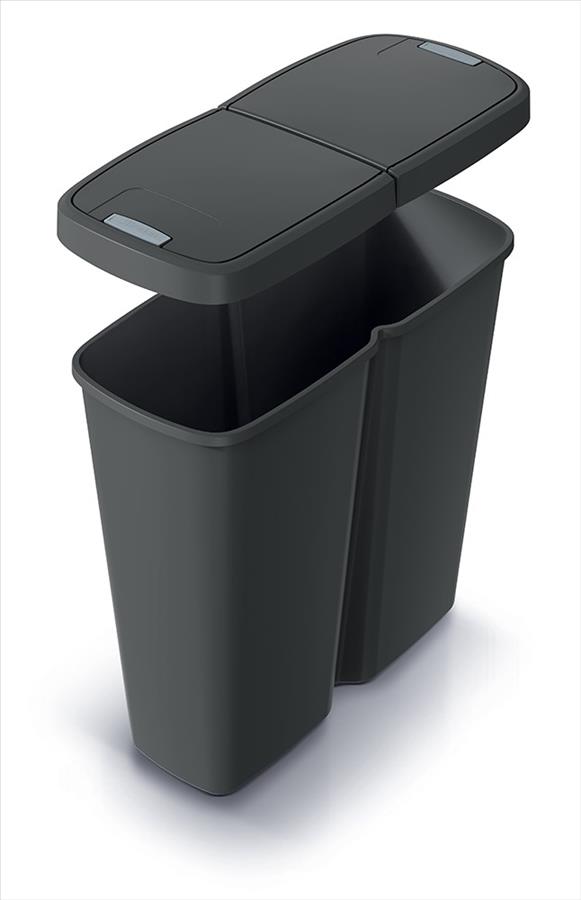 Odpadkový koš Prosperplast COMPACTA Q DUO se skládá z jedné velké vnitřní nádoby. Přesto vám usnadní třídění odpadu u vás doma i v kanceláři. Je totiž vybavený dvojitým víkem s tlačítkovým otevíráním, na které můžete uchytit jeden nebo rovnou dva odpadkové pytle. Do jednoho z nich vyhazujete například smíšený odpad, do druhého plast nebo třeba papír.