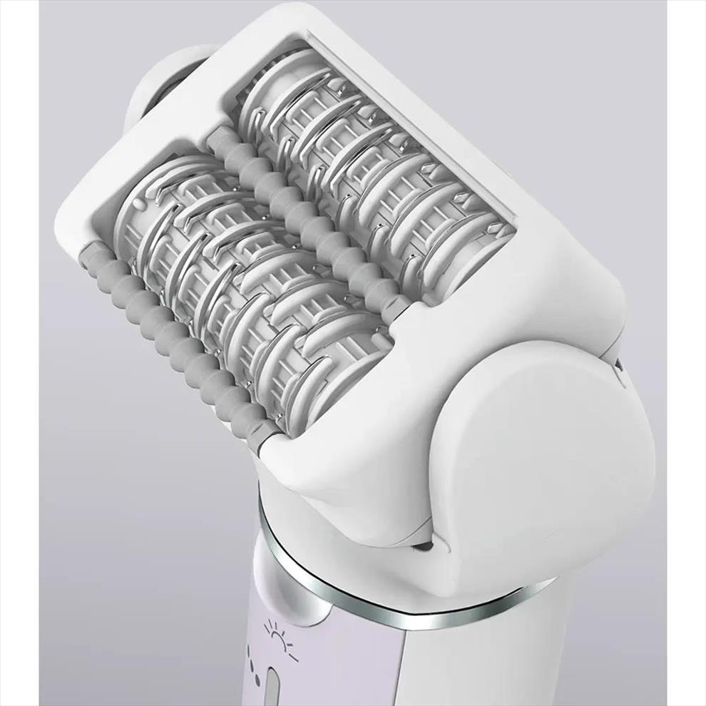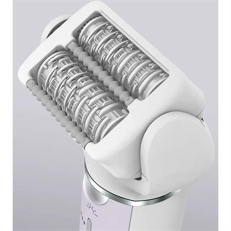 Epilátor, dvě řady kotoučů se 60 pinzetami pro účinnou epilaci, pohyblivá hlava se sklonem až 90°, odstraňuje chloupky už od délky 0,5 mm, 3 rychlosti: silný, normální, měkký, mokrá/suchá epilace, bílá