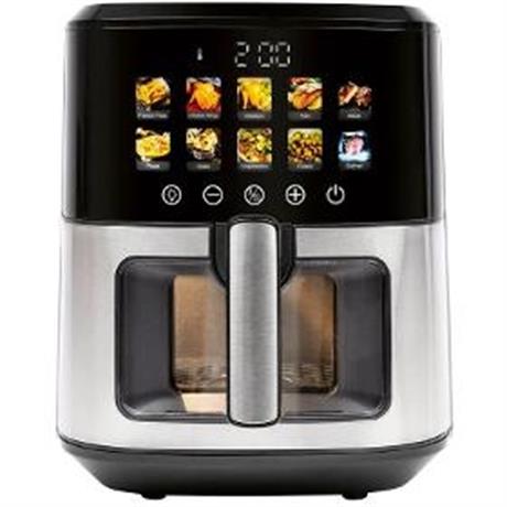 Horkovzdušná fritéza. ProfiCook FR 1286 H 6,5 l. . Horkovzdušná fritéza pro zdravé a chutné pokrmy. Má příkon 1 700 W pro rychlou přípravu. Barevný displej s dotykovým senzorem. Automatické programy pro snadné nastavení. Funkce pro rozmrazování mražených pokrmů. Nastavení teploty v rozsahu 50–200 °C. Chladná rukojeť pro bezpečnou manipulaci. . Rozměry (V x Š x H) 32,8 x 38,9 x 37,5 cm. Hmotnost 4,8 kg. Barva černá