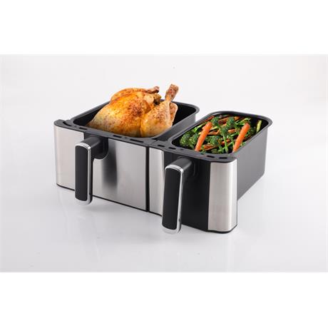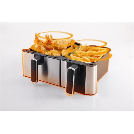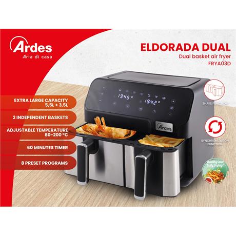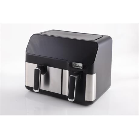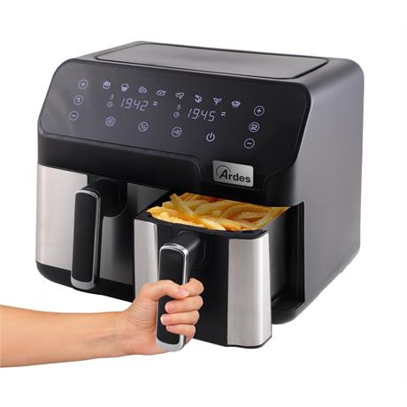Ardes horkovzdušná fritéza s dvojitým košem, extra velkou kapacitou pro rodinu, kapacita 5,5l + 3,5l. Oba nepřilnavé koše umožňují přípravu různých jídel bez míchání chutí a vůní. Oba koše jsou vhodné do myčky. Nezávislé nastavení teploty a časovač pro každý koš. Zdravá alternativa k fritéze a troubě. Dokáže vařit rovnoměrně a rychle. Technologie Rapid Air: o 80 % méně tuku a minimální zápach v kuchyni.