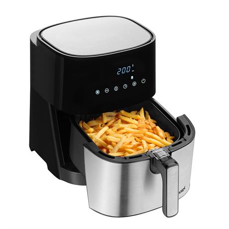 Ovládání fritézy FR5000 je velmi jednoduché a díky velkému dotykovému LED displeji také přehledné a intuitivní. Stačí zvolit jeden z 8 přednastavených programů - steak, kuře, mořské plody, ryby, pizza, hranolky, pečení, zelenina. O zbytek už se starat nemusíte. Fritéza sama nastaví čas přípravy a požadovanou teplotu. O konci programu vás upozorní zvuková signalizace. Teplotu můžete regulovat také manuálně v rozmezí od 80 – 200 °C a využít časovač, který vám pohlídá potřebnou dobu přípravy.