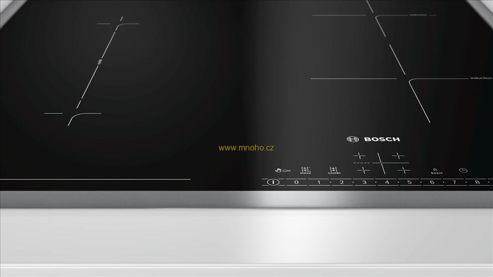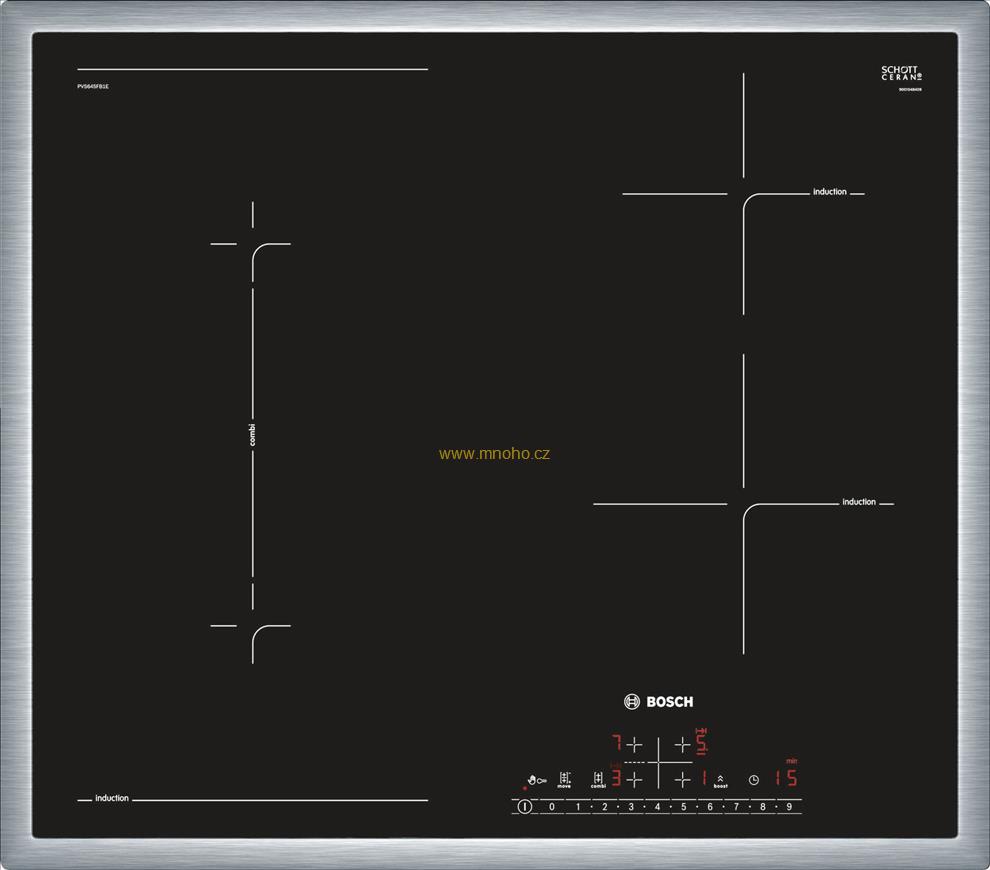 Indukční varná deska Bosch PVS645FB1E, která poskytne ovládání DirectSelect, Combi Zone poskytne možnost spojení dvou varných zón. Funkce PowerBoost, zkrátí čas uvedení do varu až o 50 procent. Dětská pojistka, bezpečnostní vypínání a časovač.