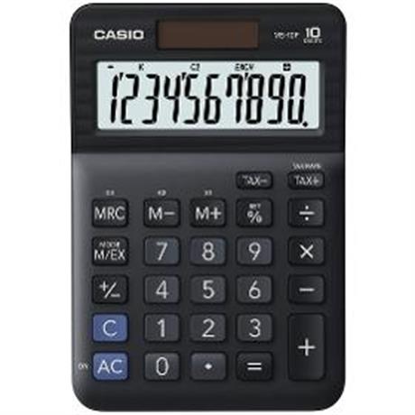 Stolní kalkulačka. Casio MS-10F. . Výpočet DPH. Převody měn (3 sazby). Profesionální výpočet procent. Výpočet marže s klávesou procent. . Klávesa změny znaménka (+/-). Vyrovnávací paměť. 3tlačítková paměť. . 10místný LCD displej. Indikace zadané funkce. Oddělovač řádů/tisíců. . Duální napájení (solar/baterie). Záložní baterie. Automatické vypnutí. . Plastová tlačítka klávesnice. Gumové nožičky. . Rozměry 101 × 27,6 × 148,5 mm. Hmotnost 105 g