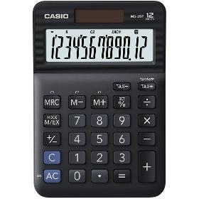 Stolní kalkulačka. Casio MS-20F. . Výpočet DPH. Převody měn (3 sazby). Profesionální výpočet procent. Výpočet marže s klávesou procent. . Klávesa změny znaménka (+/-). Vyrovnávací paměť. 3tlačítková paměť. . 12místný LCD displej. Indikace zadané funkce. Oddělovač řádů/tisíců. . Duální napájení (solar/baterie). Záložní baterie. Automatické vypnutí. Tlačítko dvojité nuly. . Plastová tlačítka klávesnice. Gumové nožičky. . Rozměry 101 × 27,6 × 148,5 mm. Hmotnost 105 g