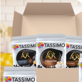 Kávové kapsle L'OR variační box, 64 kusů. . Vychutnejte si unikátní výběr prémiové kávy TASSIMO L'OR, který přináší 5 ikonických káv.. . 8× Lahodné Cappuccino. 8× Latte Macchiato. 16× Aromatické XL Classique. 16× Intenzivní XL Intense. 16× Espresso Fortissimo