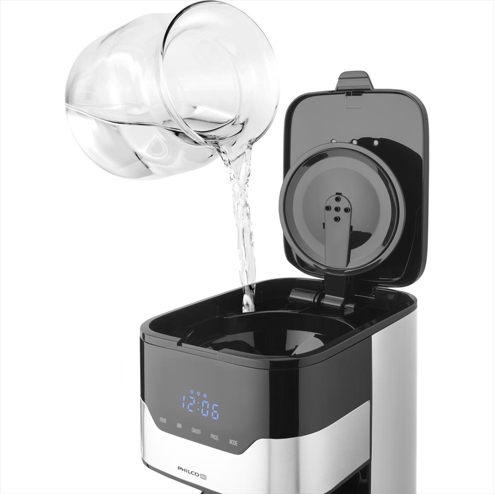 Kávovar Philco s dvoustěnnou termokonvicí o objemu 1,2 litru, LCD displejem a automatickým vypnutím.