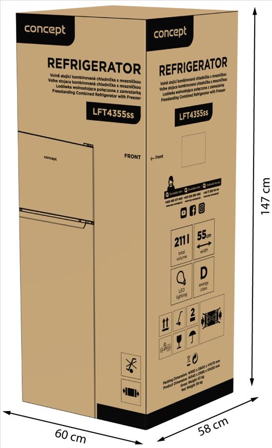 Úzká a úsporná lednice s mrazákem Concept LFT4355ss s objemem 211 l je ideální volbou do menších kuchyní. Vyniká nízkou spotřebou, tichým provozem a univerzálním, stranově zaměnitelným otevíráním dveří.