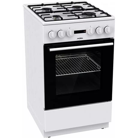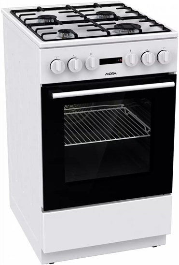 Kombinovaný sporák s multifunkční troubou, bílá barva, 4 plynové hořáky s pojistkami STOP GAS, vlevo vpředu O 5,4 cm, 1 kW, vpravo vpředu O 9,9 cm, 3 kW, vlevo vzadu O 7,4 cm, 1,9 kW, vpravo vzadu O 7,4 cm, 1,9 kW, SMALTOVANÁ dvoudílná mřížka STABIL PLUS, INTEGROVANÉ zapalování hořáků, Multifunkční trouba – 8 způsobů ohřevu, program PIZZA, program pro HOTOVÁ A MRAŽENÁ JÍDLA, ECO CLEAN – funkce na čištění trouby, regulace teploty v troubě 50–275 °C, osvětlení trouby, objem trouby 62 l, vedení v