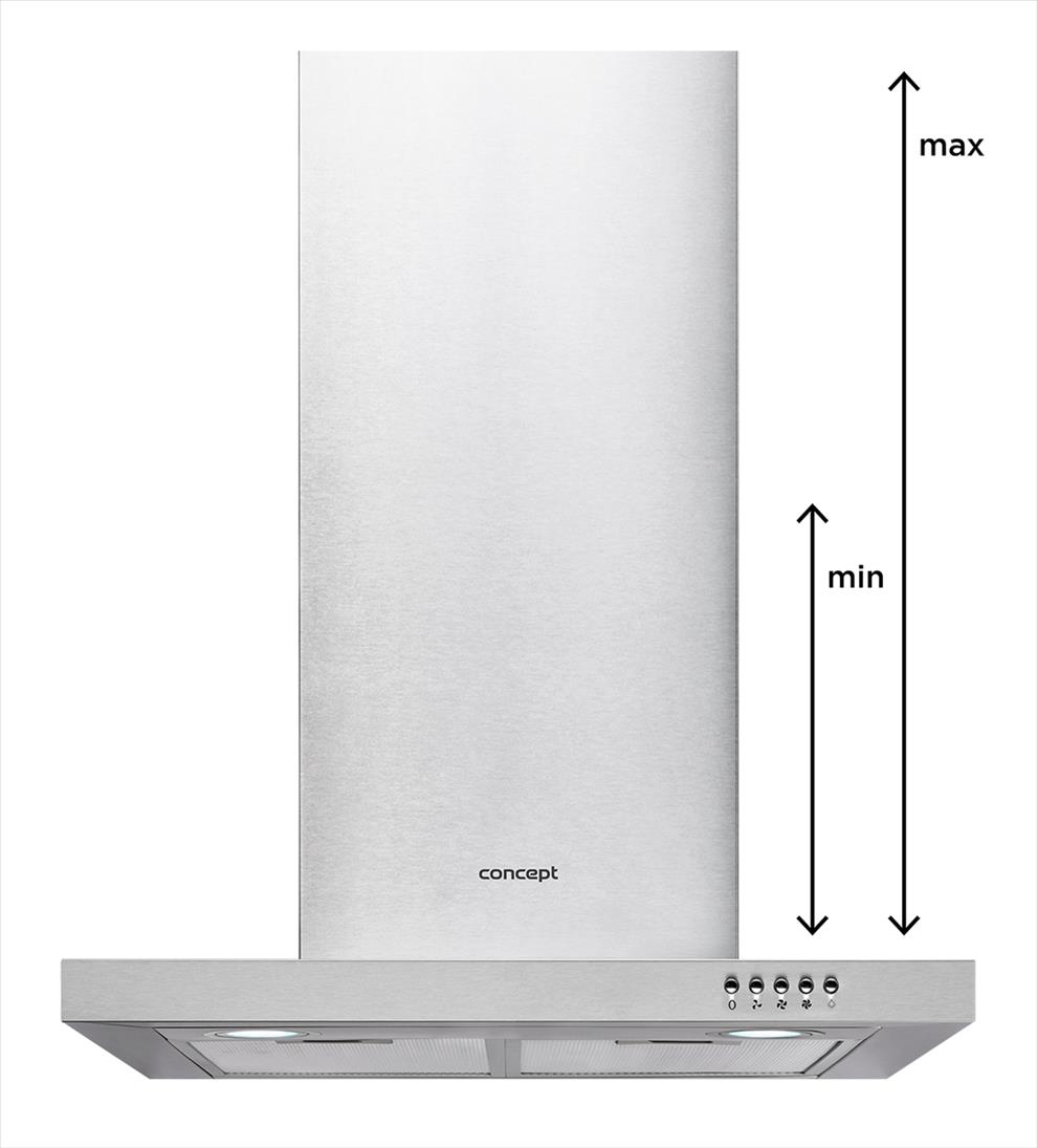 Výška odsavače je variabilní a zpravidla je udávaná v minimálních a maximálních hodnotách. V balení jsou k dispozici dvě části „komínu“, které do sebe „zapadají“. Díky tomu si můžete výšku uzpůsobit přesně podle svých potřeb.