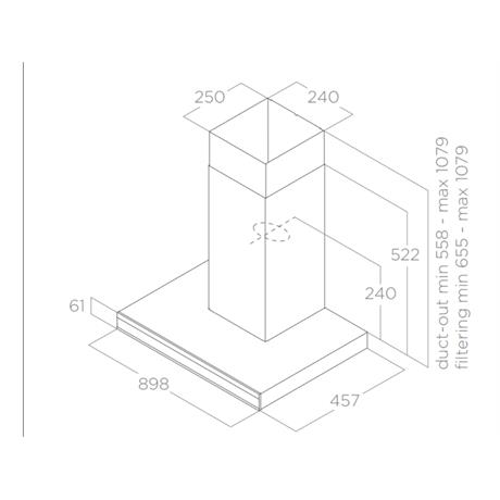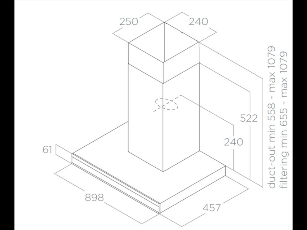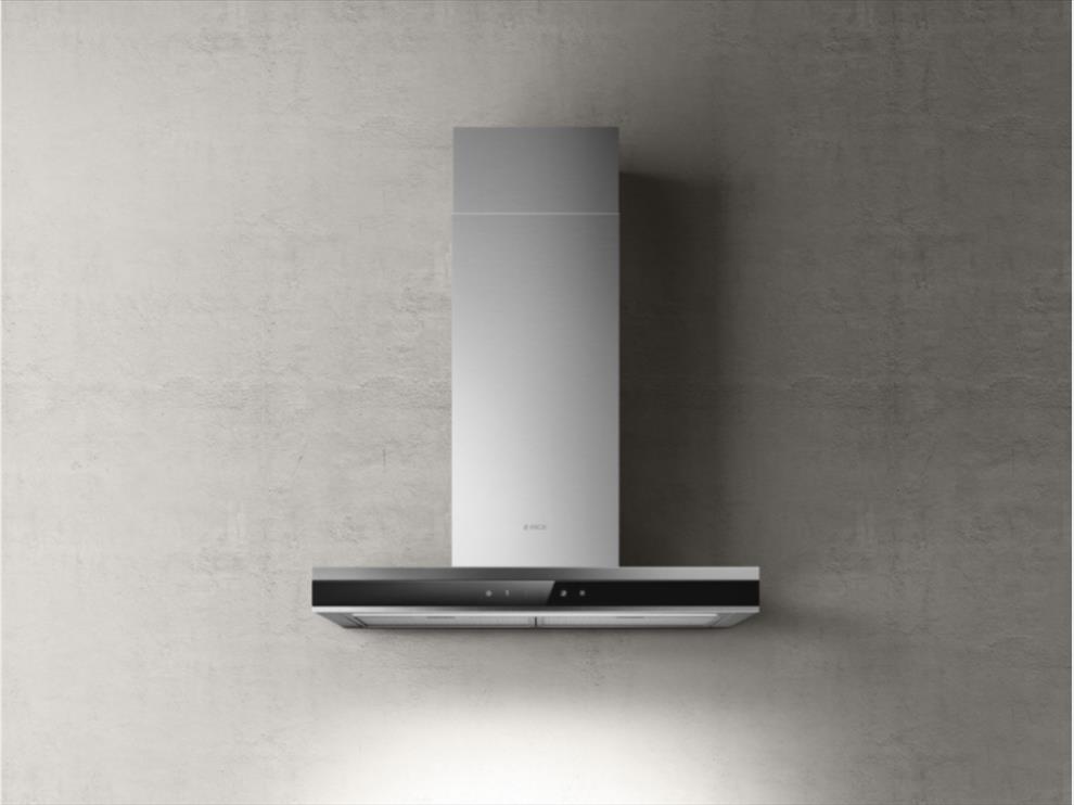 je komínový odsavač par (digestoř) z nerezové oceli, doplněný o černé sklo. Odsavač par s výkonem 325-630 m3/h a v intenzivním výkonu dokonce 770 m3/h, mile překvapí hlučností pouze 55-74 db(A) a dotykovým ovládáním.