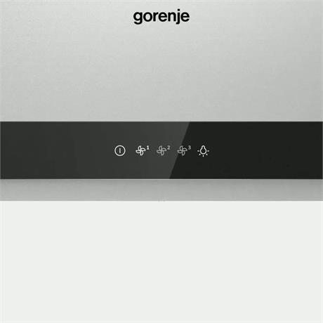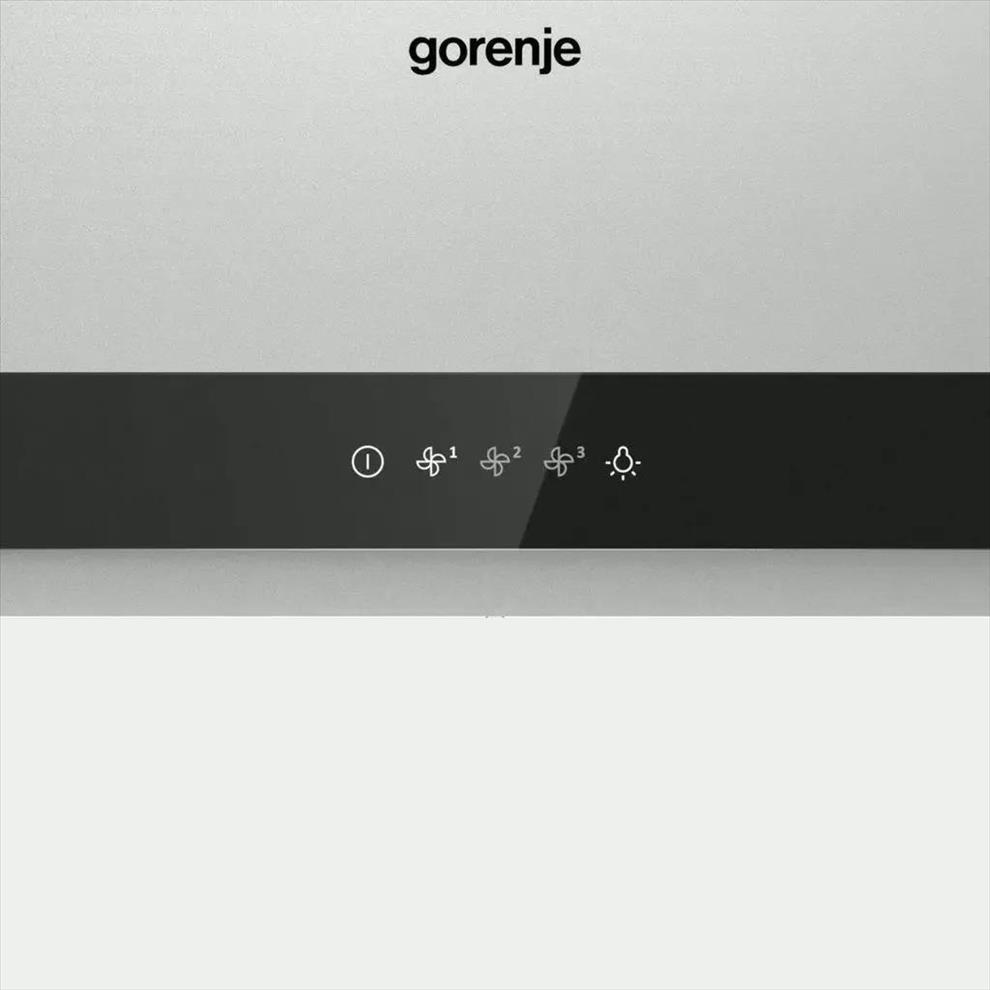 V přední části komínové digestoře Gorenje WHT643E4XBG se nachází dotykové ovládání. Jemným poklepáním na příslušné tlačítko nastavíte požadovaný výkon.
